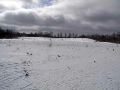 snowed-in deer beds and Trails crossing a small clearing. There